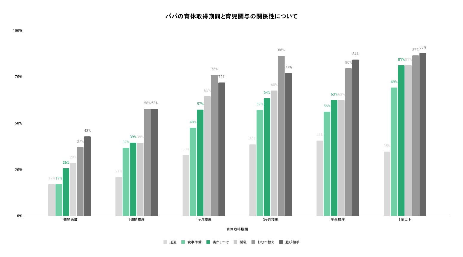 特に、「寝かしつけ」「食事準備」「授乳」では差が大きく見られました。「寝かしつけ」は1週間未満の26%に対し、1年以上取得したパパでは81%と約3倍に増加しました。「食事準備」も17%から69%へ、「授乳」も29%から81%へと伸びる結果となりました。