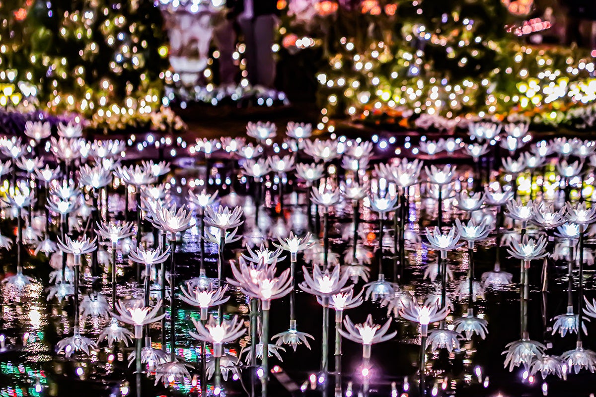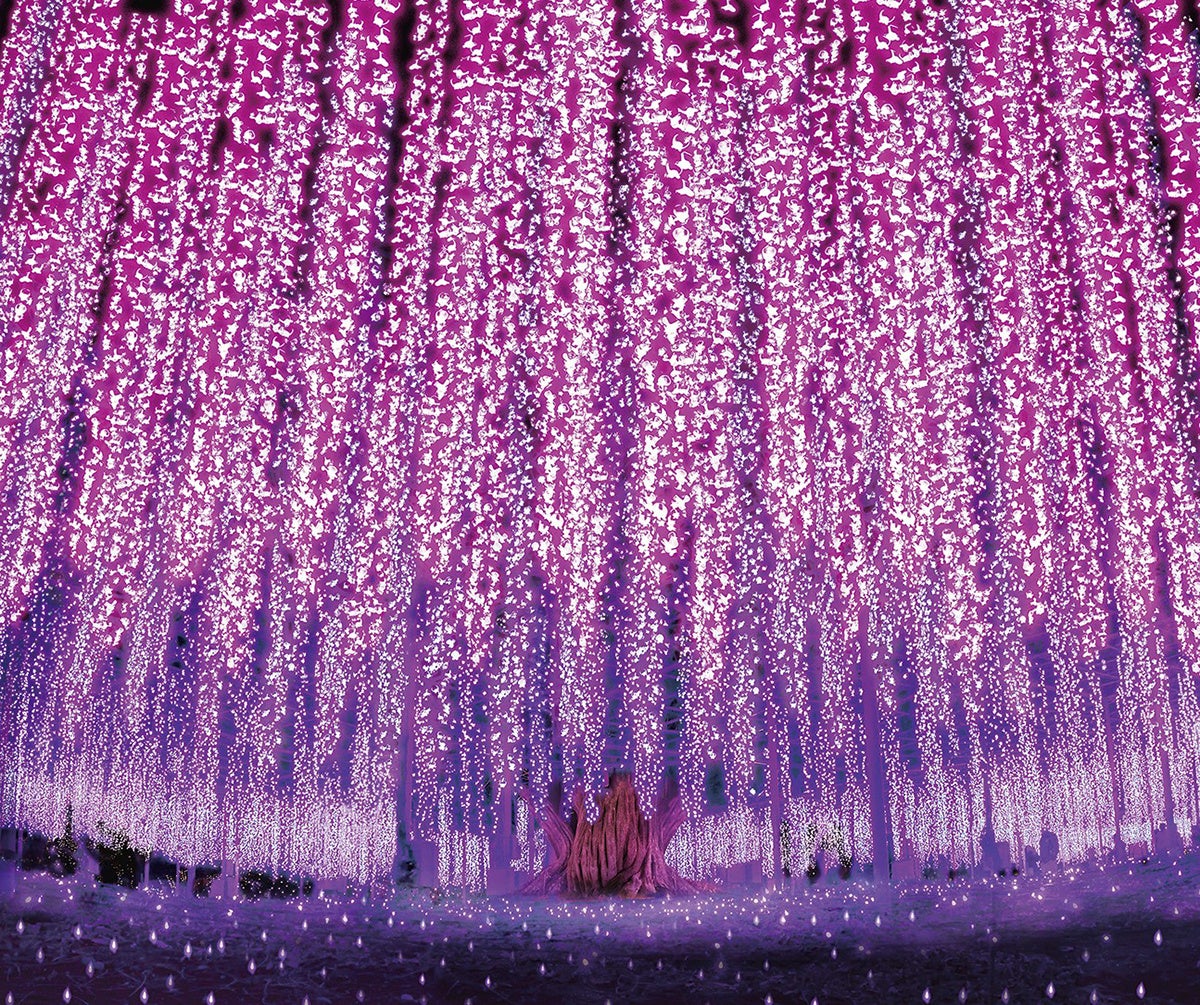 樹齢160年を超える600畳敷の大藤棚をはじめ、世界でも珍しい八重の大藤棚や80m続く白藤のトンネルなど、息を呑むほどに美しい花風景。 |