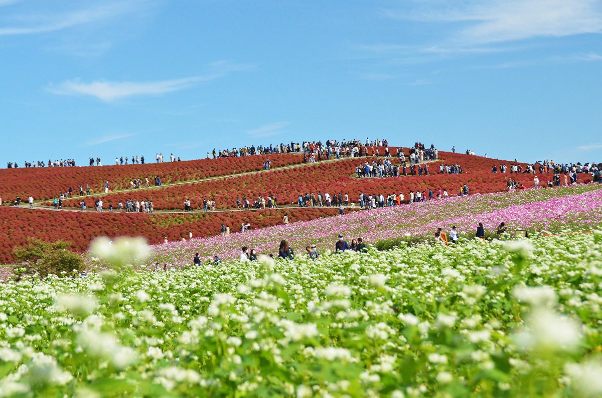 みはらしの丘は、昨年より7千本多い約4万本のコキアで埋め尽くされます。10月上旬頃から徐々に紅葉が始まり、緑と赤のグラデーション、紅葉、黄金色へと色合いが変化していきます。丘のふもとではコスモスやソバが咲き誇り、裏側ではススキとオギの群生が美しい秋の風景を創り出します。また、今年初登場のウェルカムガーデンや、秋バラなど、多彩な秋の草花が園内を鮮やかに彩ります。