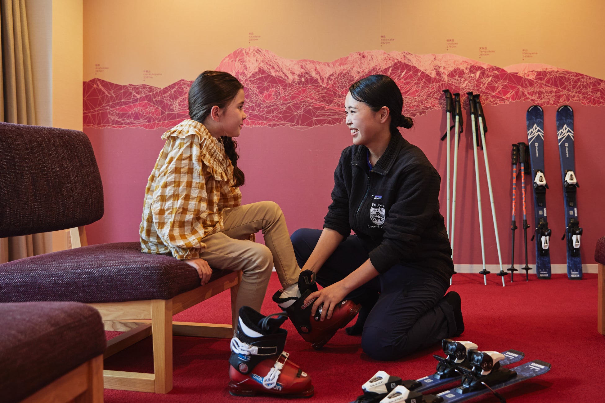 14:30 客室で「スキーデビューマイスター」がスキーギアをフィッティング