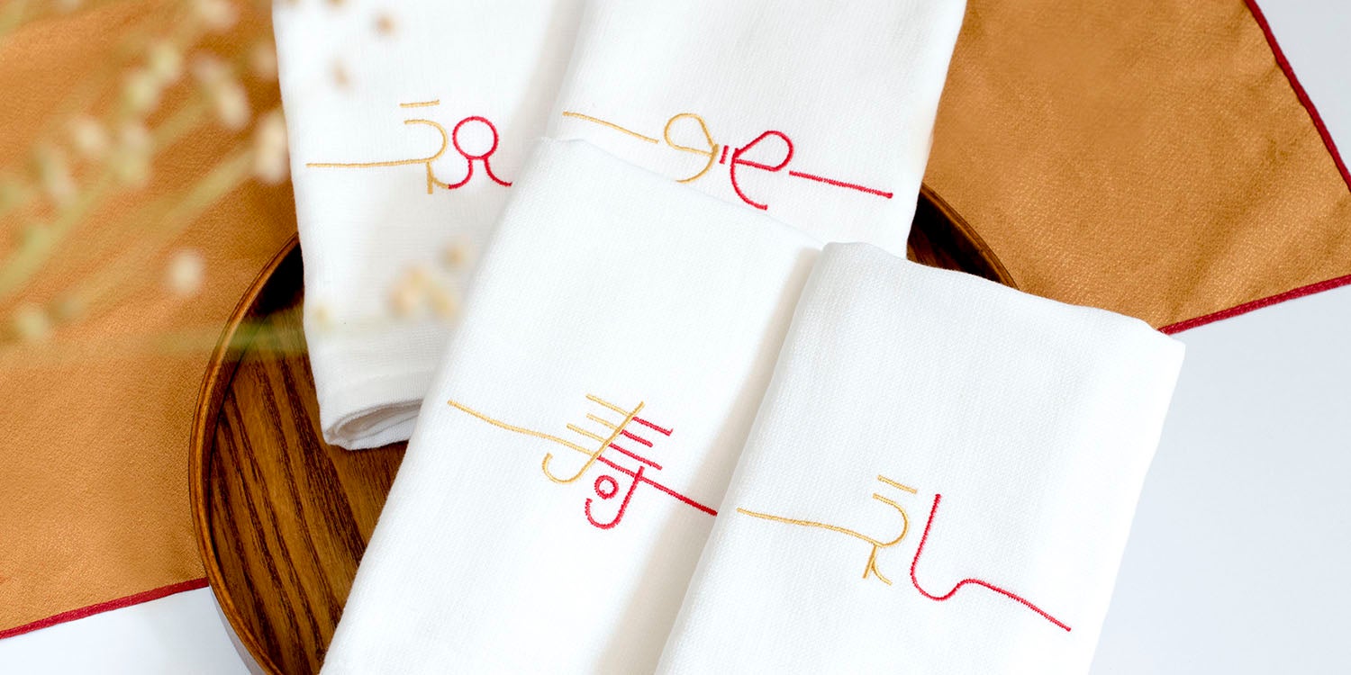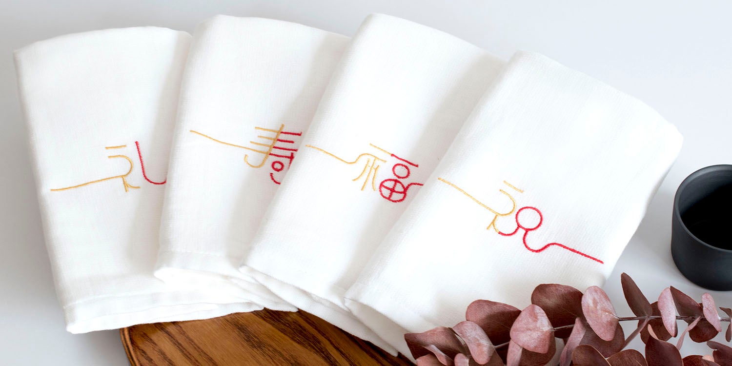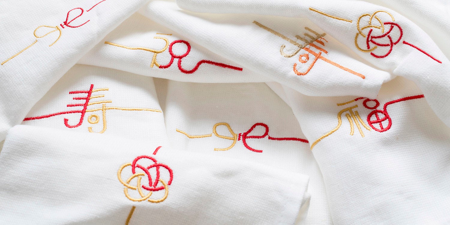 お配りに合う文字を厳選し、刺繍で水引きを表現しました。水引きの定番、梅結びと蝶結びもございます。