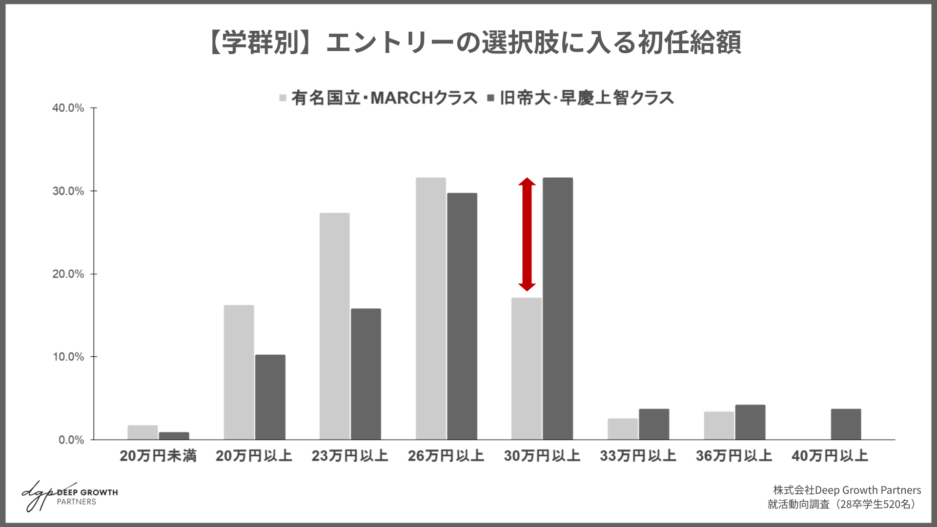 株式会社Deep Growth Partners(本社:東京都渋谷区、代表取締役 出谷昌裕)は、2028年卒業予定の大学生520名を対象に「初任給に関する意識調査」を実施しました。28卒学生と27卒学生の比較、および学群別の分析を通じ、初任給に対する期待値が大幅に上昇していることが明らかになりました。