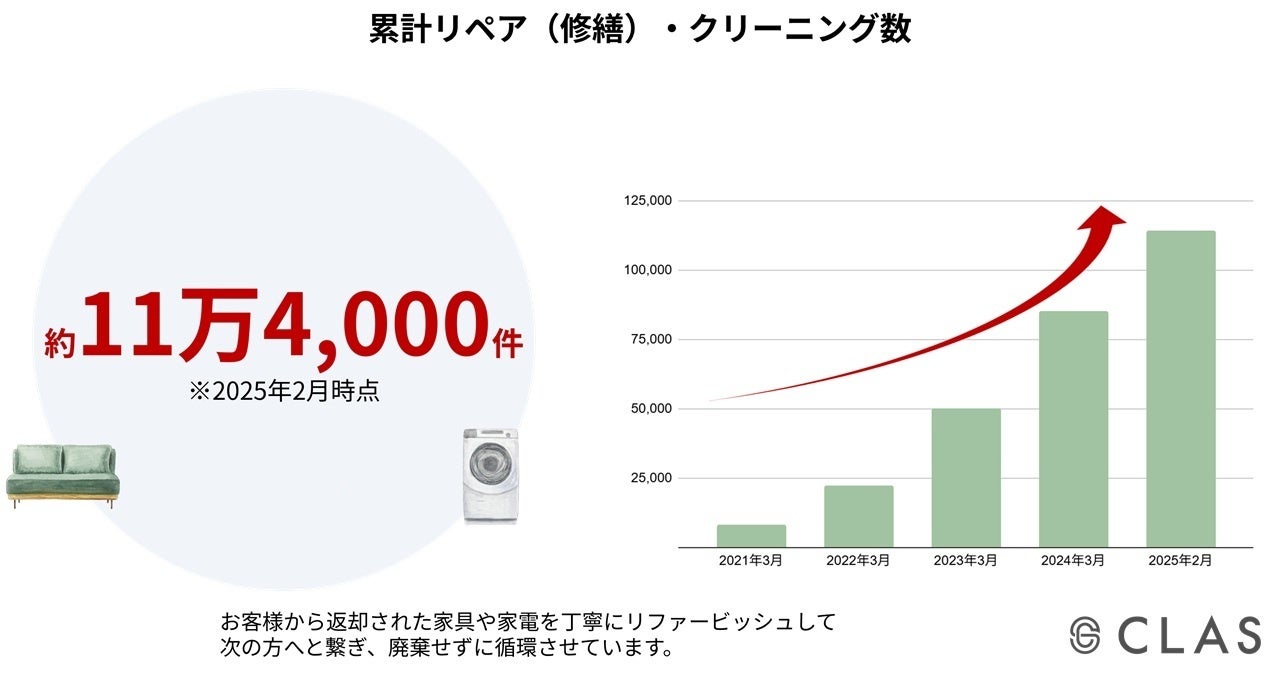 クラスでは、利用後に返却された製品をリペア(修繕)・クリーニングし再活用することで、家具・家電の廃棄を回避し、廃棄物発生量の削減に貢献してまいりました。2025年2月時点で累計11万件以上のリペア・クリーニング実績があります。