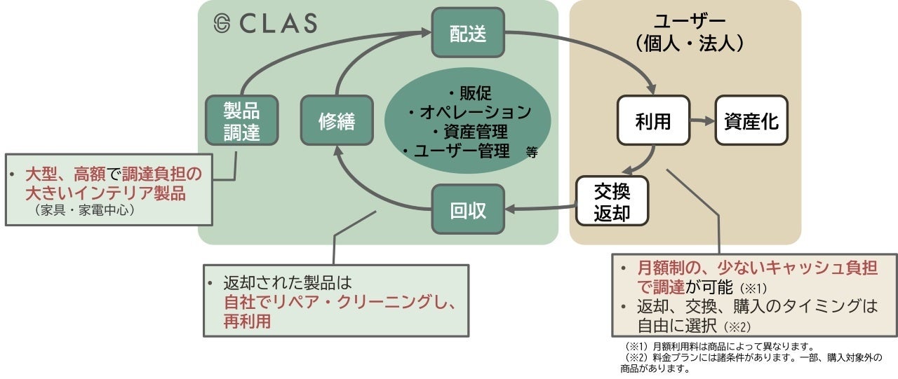 株式会社クラスは「“暮らす”を自由に、軽やかに」をビジョンに掲げ、個人・法人向けに循環経済型ビジネスを展開しています。家具や家電などの耐久消費財を月額制で提供し、従来の購入や分割払い、レンタルに代わる新しい利用・取得体験を創出します。