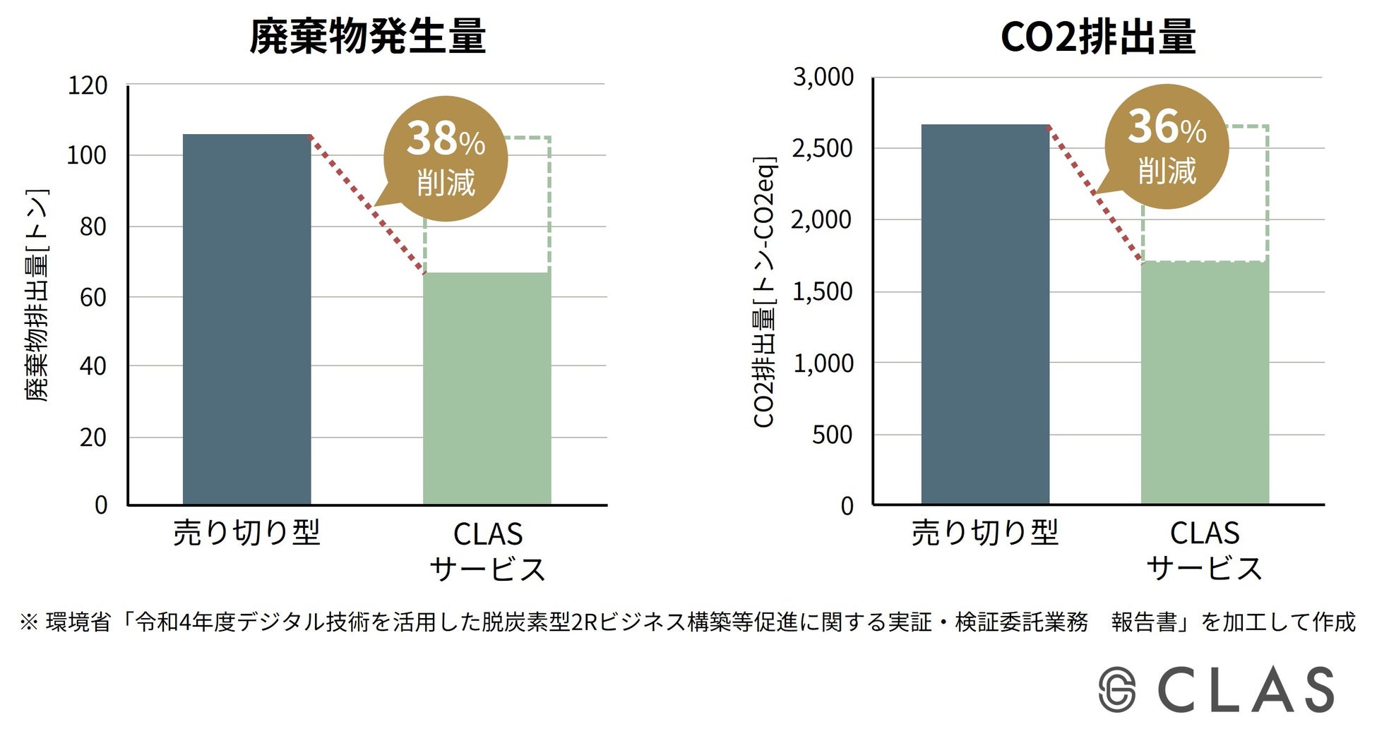 その結果、クラスのサービス(報告書では「脱炭素型2Rビジネス」として定義)は、従来の売り切り型と比較して、廃棄物発生を38%削減し、CO2排出を36%削減する効果があることが示されています。
