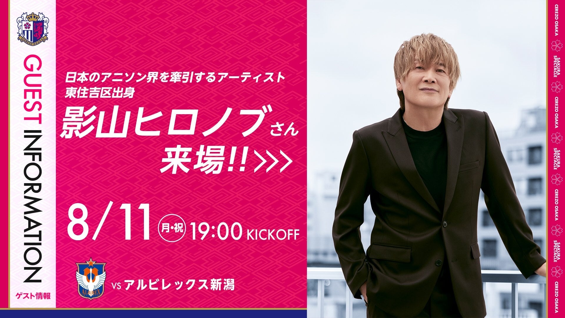 本イベントでは、各試合日に地元大阪にゆかりのあるアーティストをお招きし、ここにしかないエンターテインメント体験をお届けします。8/11(月・祝)アルビレックス新潟戦には、大阪市東住吉区出身のアーティスト 影山ヒロノブさん、8/23(土)ヴィッセル神戸戦には大阪市西成区出身のラッパーSHINGO★西成さん、8/31(日)サンフレッチェ広島戦には、大阪発の 5 人組ロックバンド Novelbright の皆さまにご来場いただく予定です。
