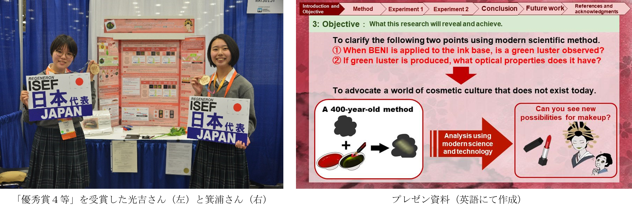 本校からは、JSEC2022にて「協賛社賞(ソニー賞)」を受賞した3年の箕浦 祐璃さんと光吉 音葉さんが出場し、“Analyzing a 400-year-old mystery: producing green makeup from ink and Beni”という研究タイトルで、「材料科学部門 優秀賞4等」を受賞しました。