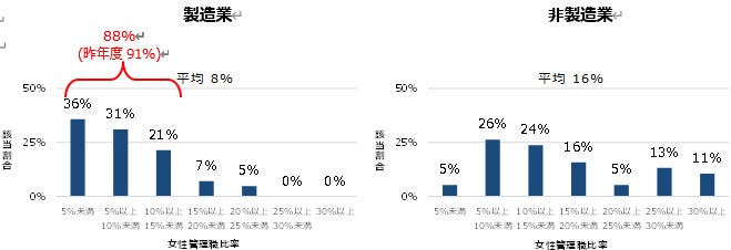 ・女性管理職比率、男女間賃金格差の平均値や分布状況は、製造業/非製造業で大きな違い