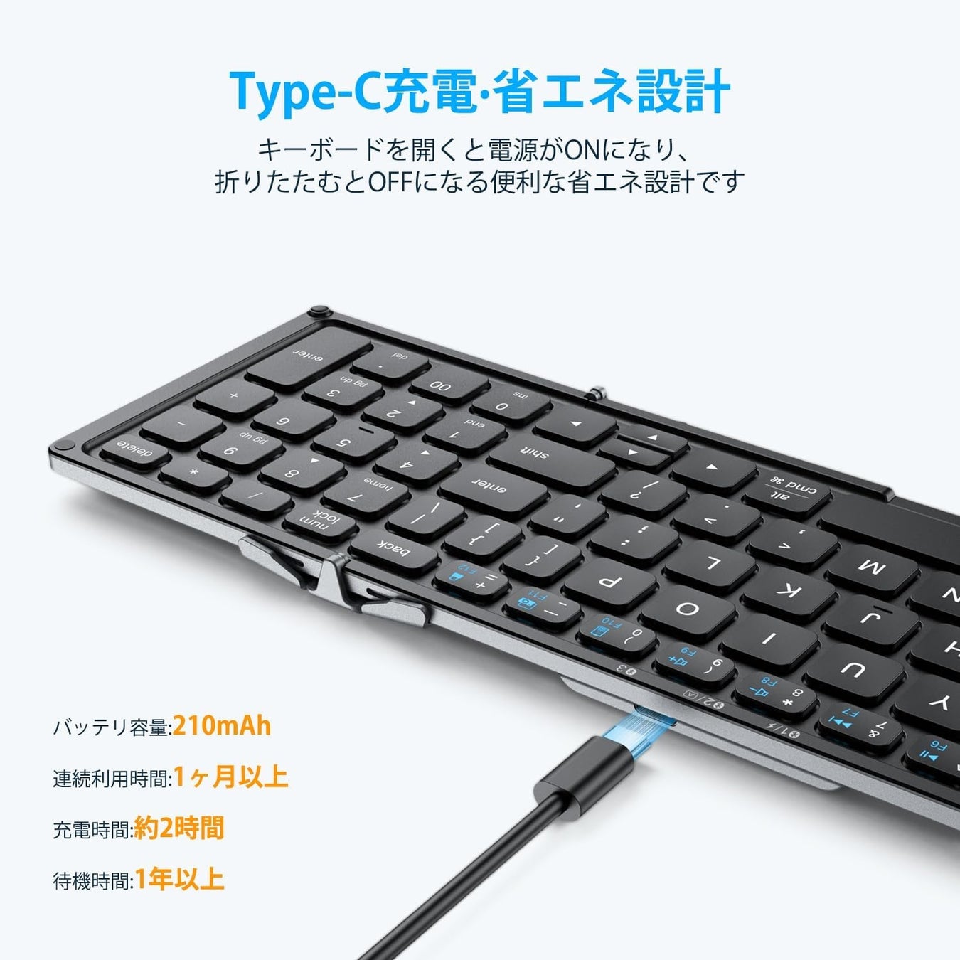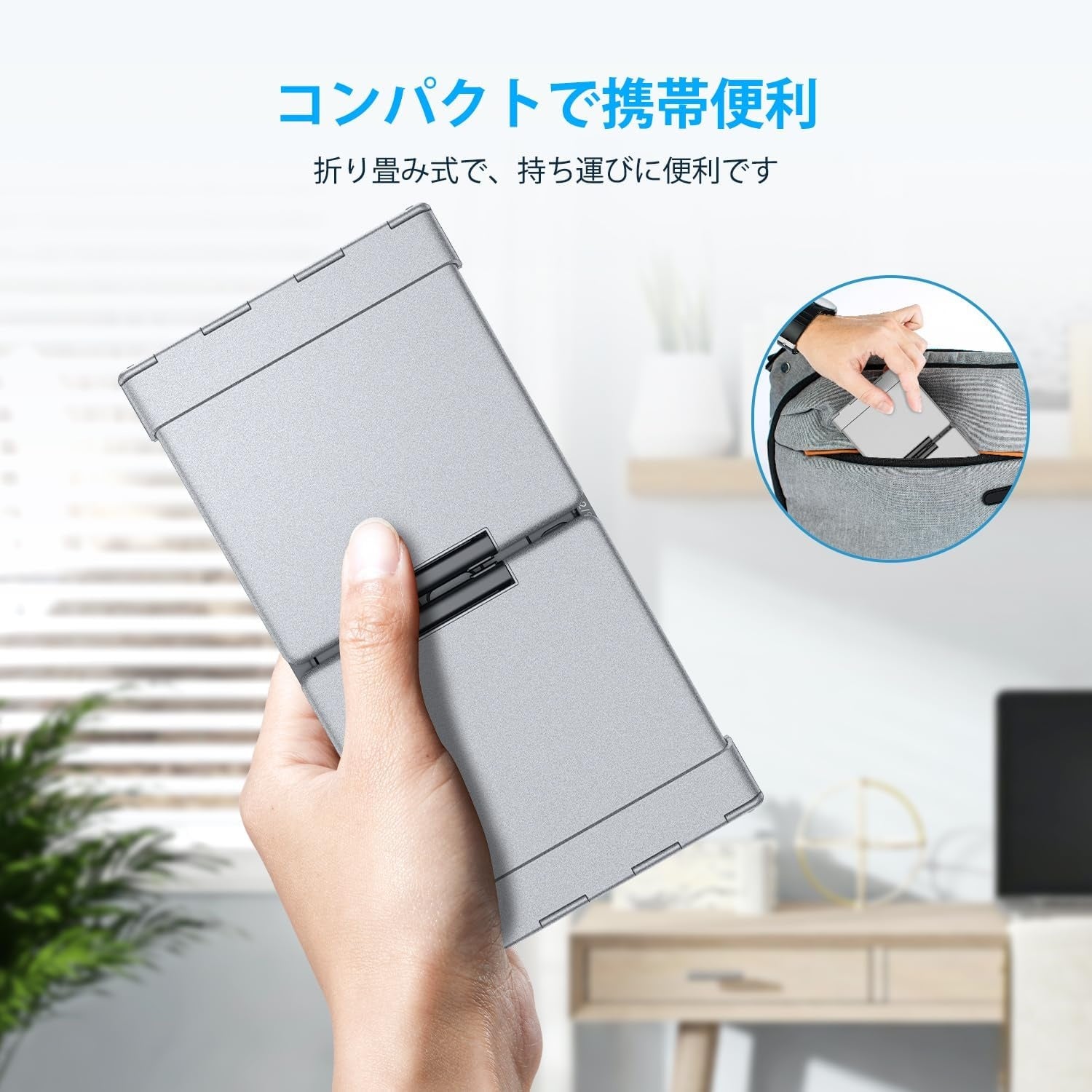 軽量設計で、折りたたむとコンパクトになり、スマホ感覚で持ち運ぶことができます。また、キースイッチはパンタグラフ構造を採用しており、折りたたみ式ながらもノートパソコンのような快適な打鍵感を提供します。