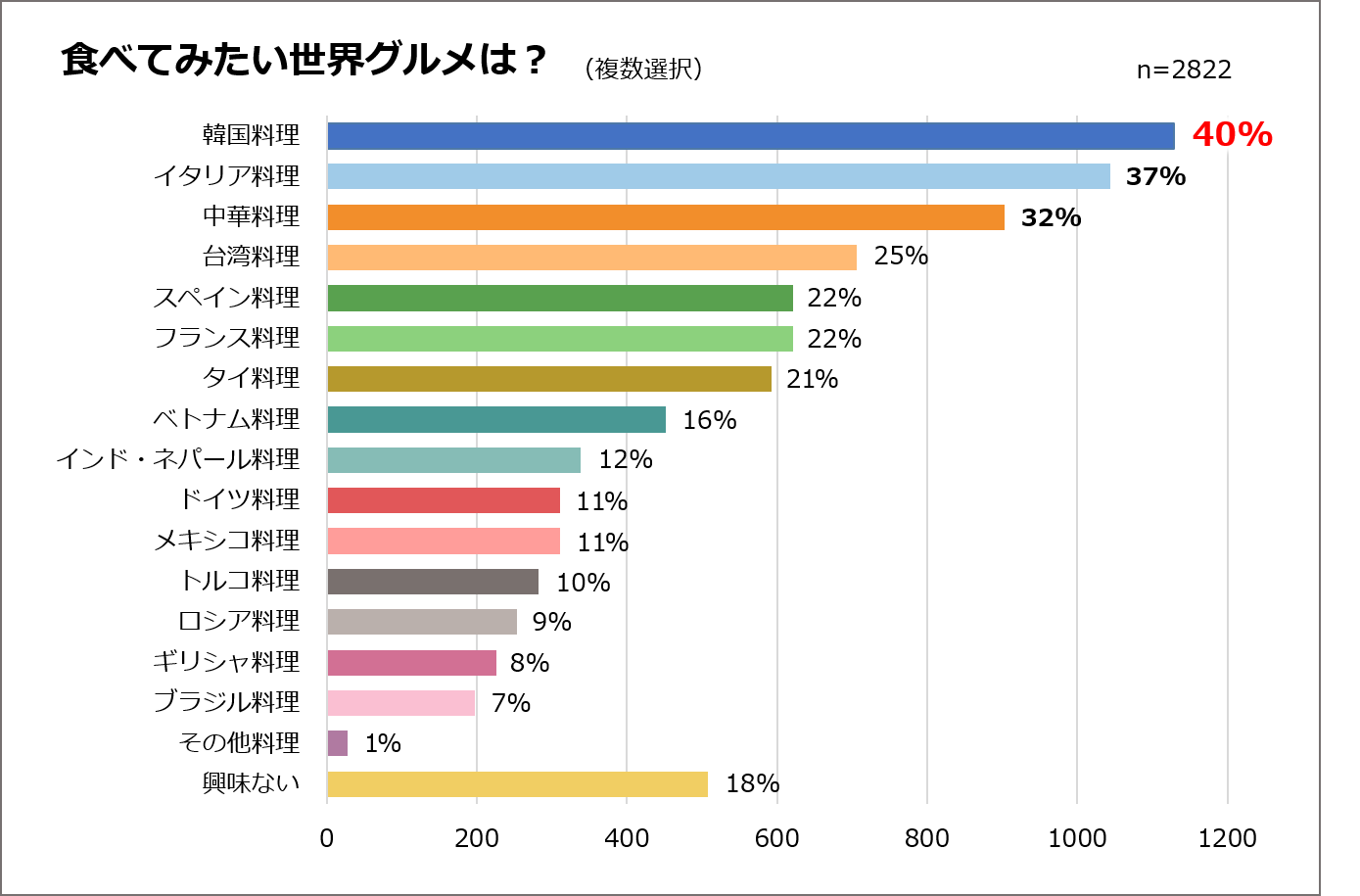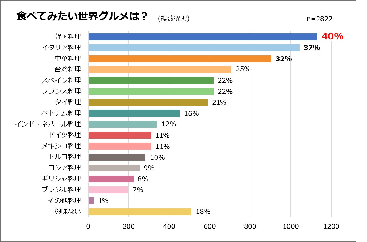 具体的な作って食べてみたい世界グルメに関しては、定番ともいえるイタリア料理や中華料理をおさえ、全体の約40%の人が韓国料理を選択しました。韓国料理のトレンドは今や外食だけでなく、内食にも及んでいることが分かりました。