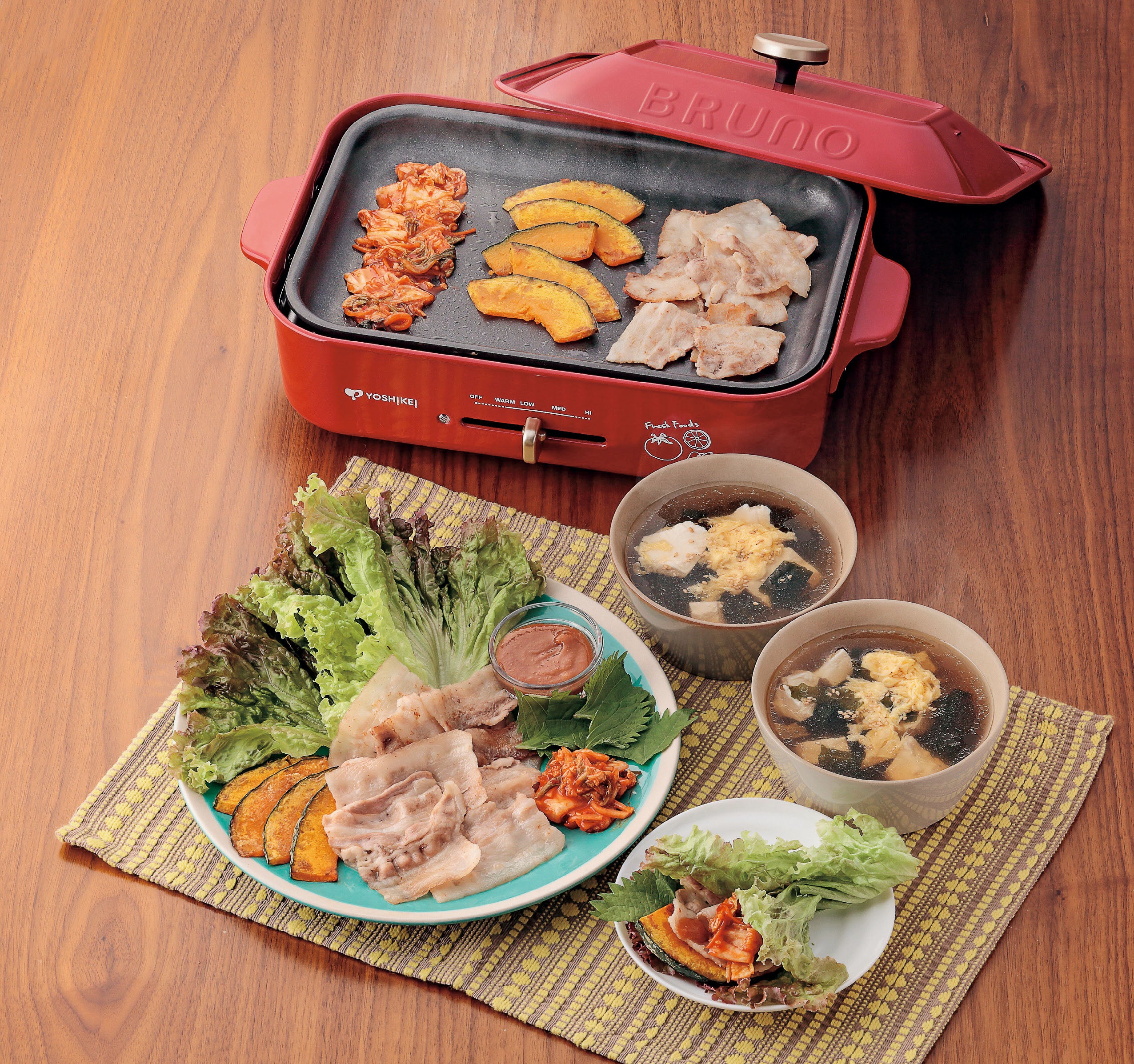 主菜の味付けのコツはみそだれ!韓国で親しまれているサムジャンという調味料をイメージして作りました。ホットプレートを使わず、フライパンを使って作ることもできます。副菜は、ごまが香るあっさりとした味付けです。少しお酢を加えたり、仕上げにラー油をかけたりして味変することもできます。