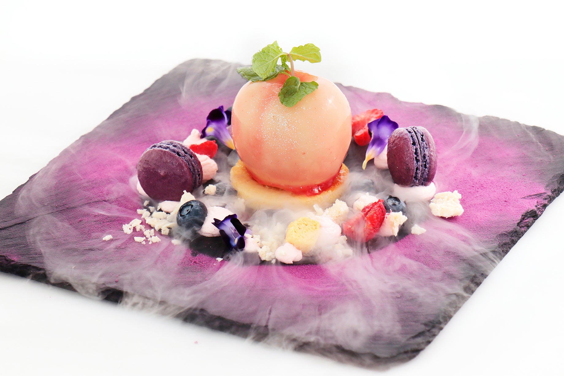 液体窒素を使用した桃のシャーベットを散りばめて仕上げます。