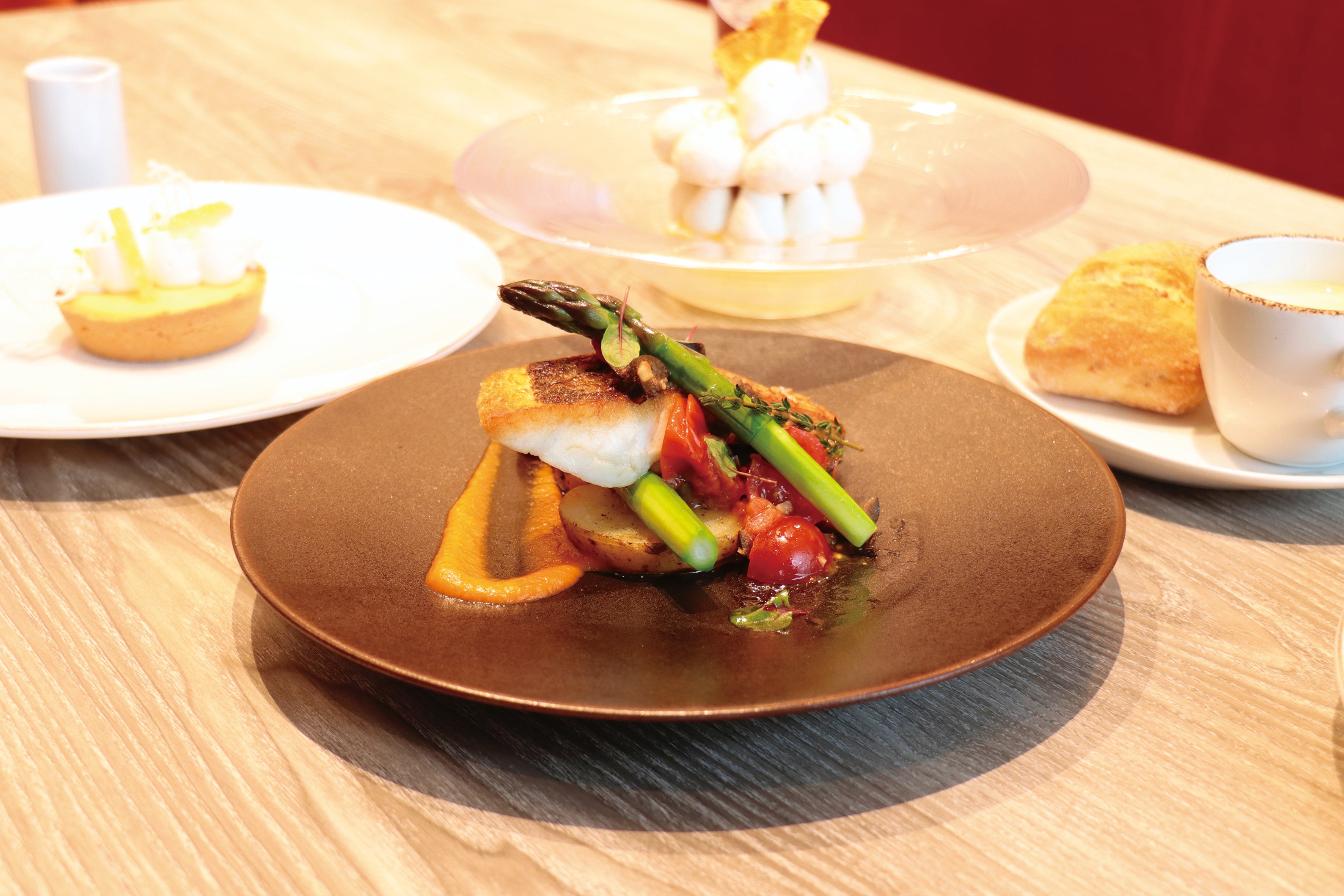 皮面をパリッと焼き上げた「真鯛のポワレ」真鯛をトマトとオリーブとケッパーを使用した南仏風のスタイルでお召し上がりください。