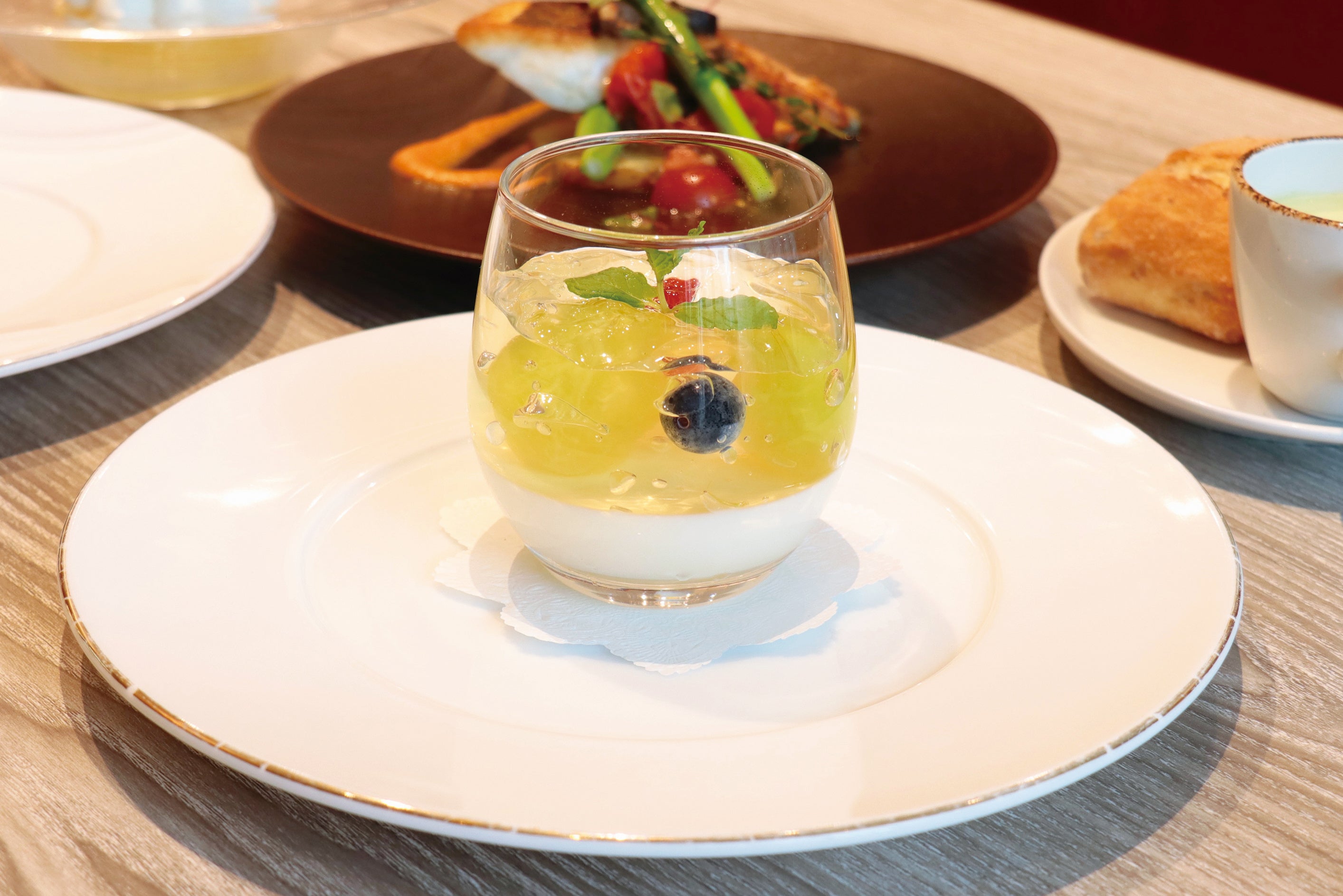 くちどけの良いローズマリー風味のブランマンジェと メロンのジュレの2層で組み立てました。