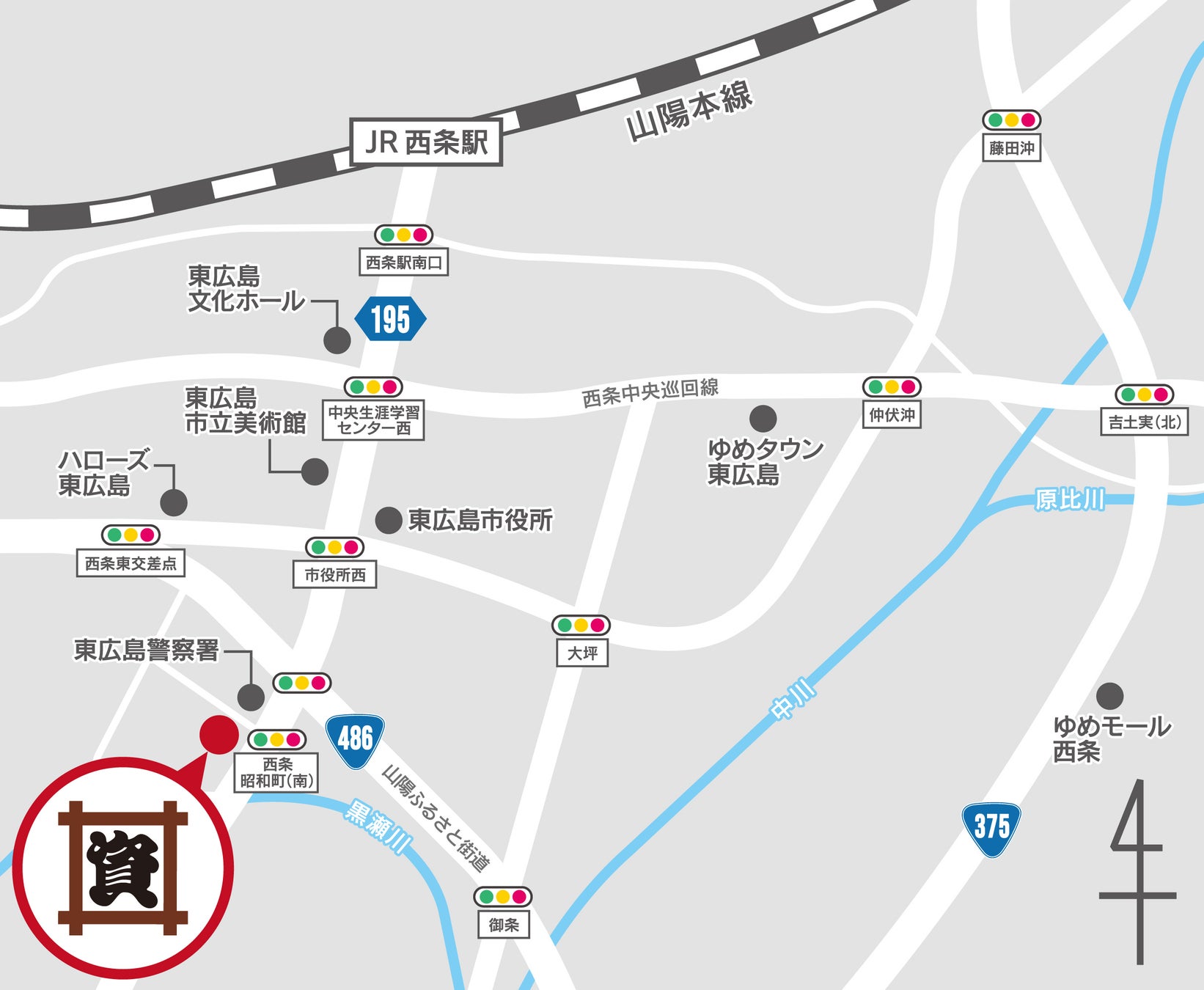 「資さんうどん東広島西条店」が出店するエリアは、ショッピングセンターなどの商業施設や飲食店も多く、市役所や学校、美術館などの文化施設も充実した東広島市の中心部となります。県道195号線沿い「東広島警察署前」の交差点のすぐそば、JR山陽本線西条駅からも徒歩約15分の場所に位置しますのでお車でも公共の交通機関でも便利にお越しいただくことができ、地域の皆さまに日常的に便利にご利用いただけます。