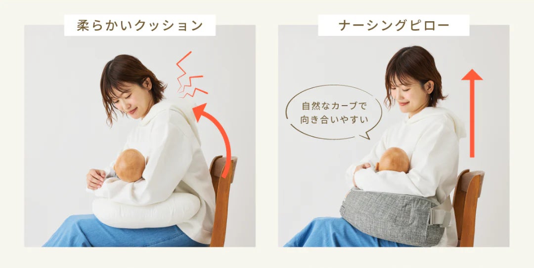 赤ちゃんとママがおへそを向かい合わせる理想的な姿勢(ラッチオン)を自然に導きます。適度な高さと固さで授乳時の快適な姿勢をキープし、密着授乳を実現します。