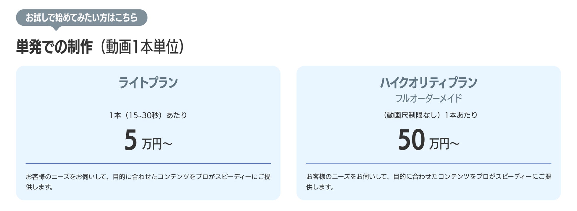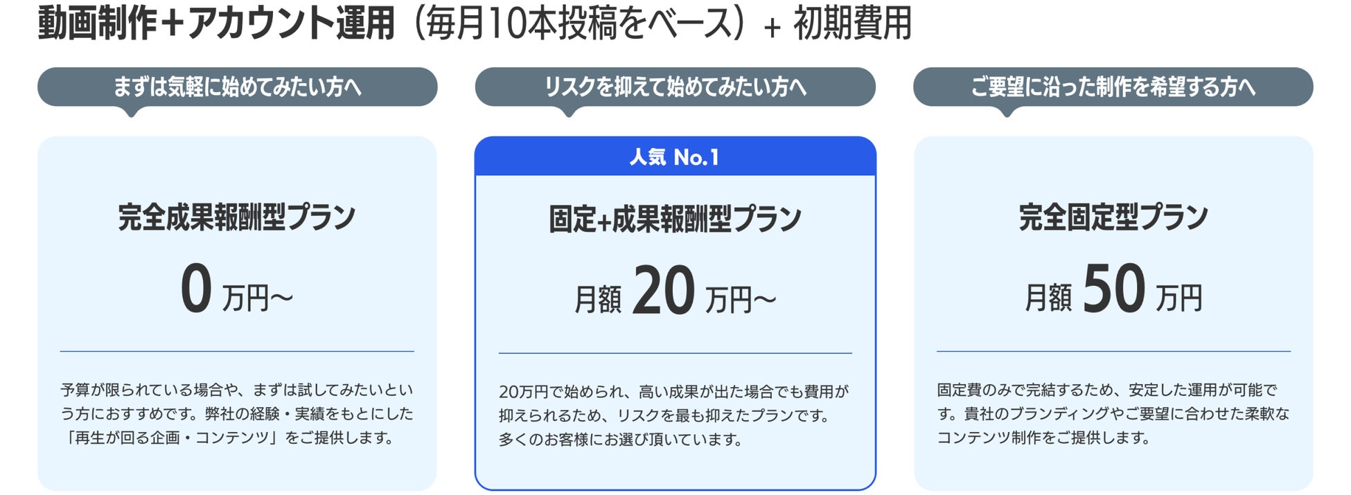 実際に運用をお任せしたい事業者様向けに、動画制作とアカウント運用(毎月10本投稿をベース)を含む以下の3種類のプランをご提供しています。また、動画制作を1本単位でも承っておりますので、まずはお試しで動画制作をご希望の方には、単発の動画制作プランもご用意しております。
