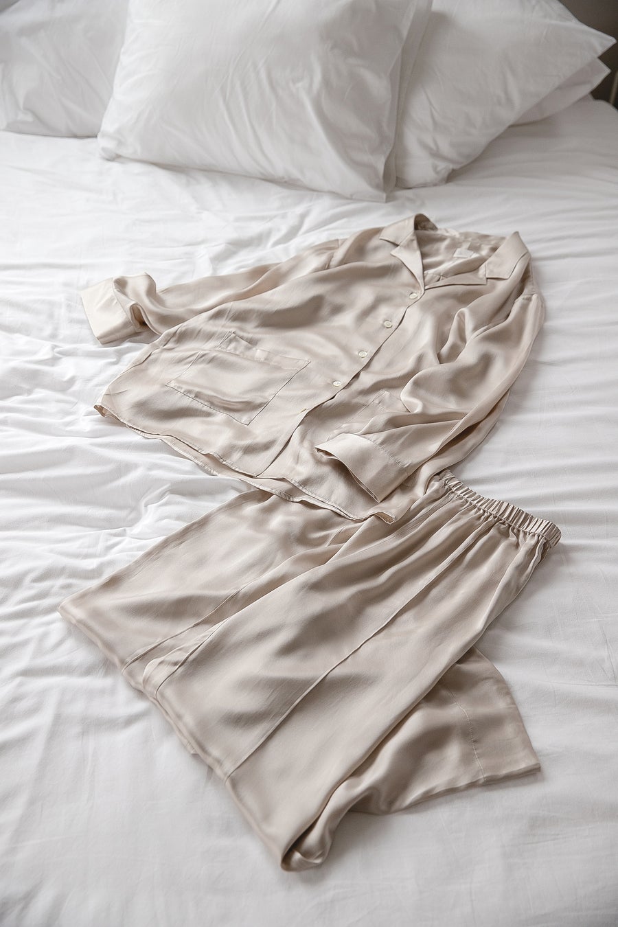 御堂筋沿いに立地するホテルの高層階で、上質な時間を過ごすのにぴったりのシルクのナイトウエア(イメージ)