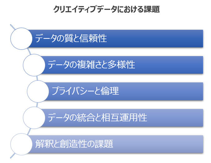 クリエイティブデータにはいくつかの課題が存在します。データの質と信頼性、データの複雑さと多様性、プライバシーや倫理、データの統合と相互運用性、解釈と創造性の課題が挙げられます。クリエイティブデータは主観的な要素や感情を含み、データの解釈や創造性に頼る部分もあります。また、データの質や信頼性の確保、データの多様性と統合、プライバシー保護や倫理的な取り組みの重要性も考慮しなければなりません。クリエイティブデータの課題に対処するためには、適切なデータ収集方法や分析手法の選択、データの品質管理、個人やチームのクリエイティブな解釈力の育成が求められます。これにより、より正確で有益なクリエイティブなインサイトを得ることができます。クリエイティブテック分野では、クリエイティブデータの課題を克服し、データを有効に活用することで、クリエイティブな作品やプロジェクトの品質向上と効果的な展開を実現することが重要となります。