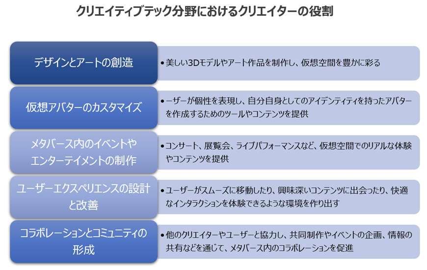 多様な分野や産業の融合を促進し、新たなビジネスモデルやイノベーションの創出にも寄与しています。例えば、クリエイティブテックとスマートテクノロジーの組み合わせによって、スマートシティの開発やインタラクティブな商品やサービスの提供が可能になります。