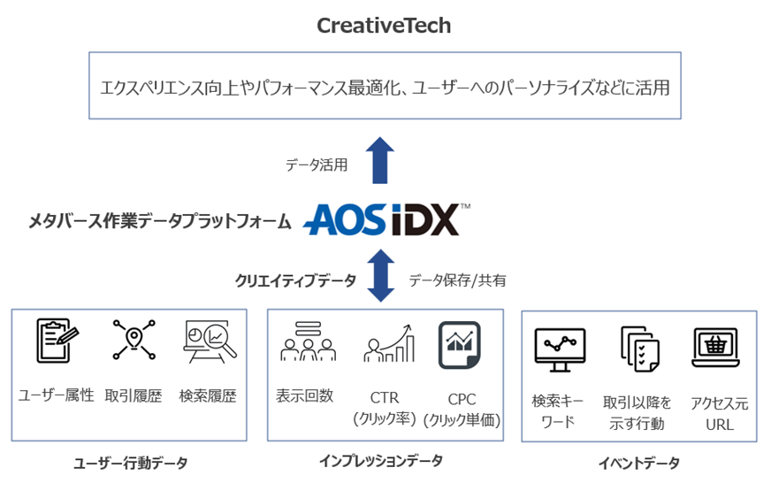 「メタバース作業プラットフォーム AOS IDX」は、クリエイターを取り巻く環境において生成される膨大なデータを管理するためのクリエイティブテックにおけるデータプラットフォームです。