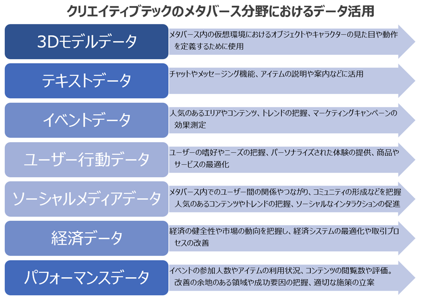 メタバース分野ではさまざまな具体的なデータが収集・分析されます。これには、3Dモデルデータやテキストデータ、イベントデータ、ユーザー行動データ、ソーシャルメディアデータ、経済データ、パフォーマンスデータなどが含まれます。これらのデータは、メタバース内の仮想環境やユーザーエクスペリエンスの向上、パーソナライズされたコンテンツの提供、経済システムの最適化などに活用されます。データプラットフォームを通じて収集されたデータは、メタバースの創造力や魅力を高め、ユーザーにとってより豊かな仮想体験を提供するために重要な役割を果たしています。