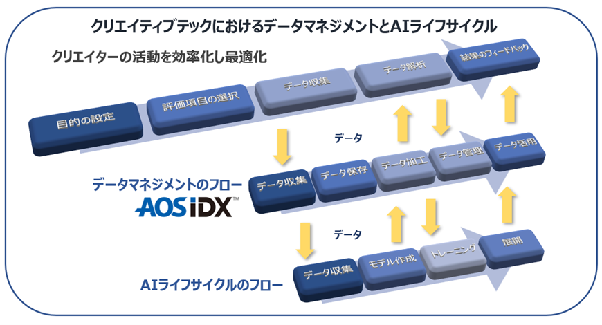 AOS IDXでは、こうしたAIライフサイクルの仕組みとマルチモーダルAIへの適用に基づき、AIデータにおけるAIシステムのためのAIデータ管理を行い、企業における優秀なデータがあって初めて優秀なAIシステムを実現できるというData to AIのコンセプトの元、AOS IDXによって、クリエイティブ分野におけるクリエイターのパフォーマンス向上に向けたプラットフォーム構築を支援します。