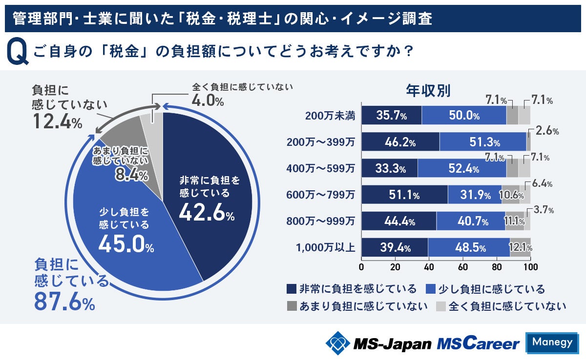 続いて、税金の負担額に対する考えを尋ねたところ、87.6%が「負担に感じている」と回答していました。