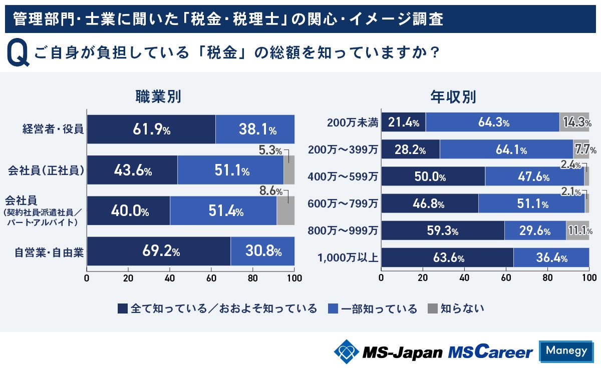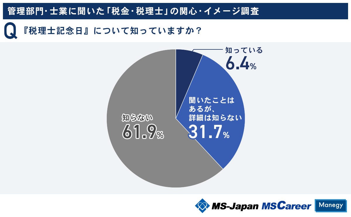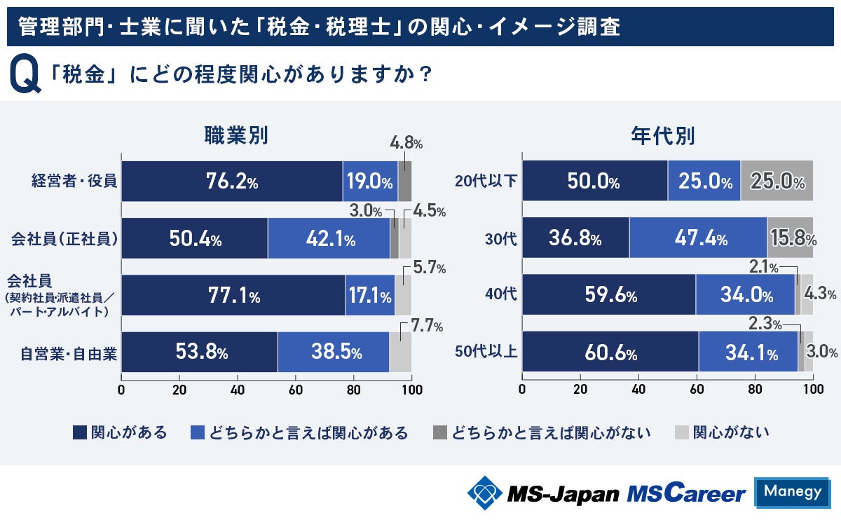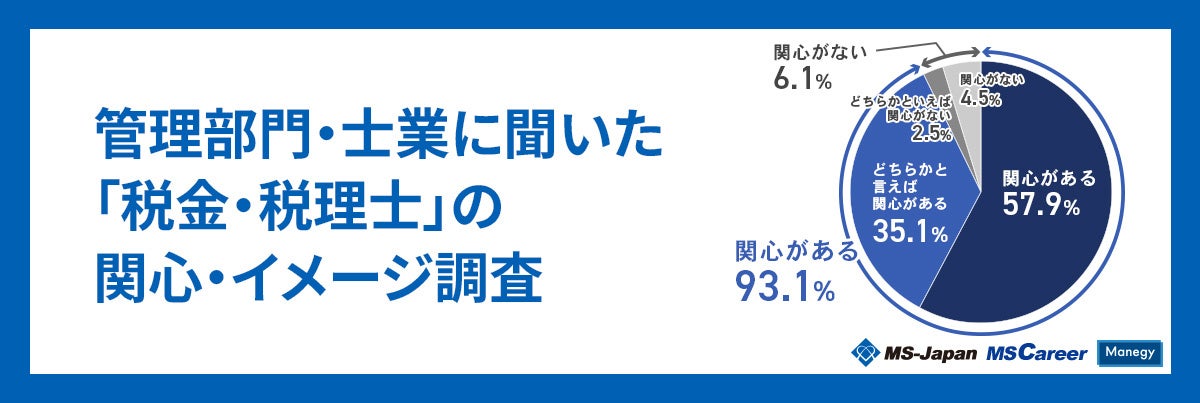 株式会社MS-Japan(本社:東京都千代田区 代表取締役会長兼社長CEO:有本隆浩/以下MS-Japan 証券コード:6539)が運営する、管理部門・士業の総合転職サービス「MS Career(エムエスキャリア)」は、2月23日の「税理士記念日」に合わせ、『管理部門・士業に聞いた「税金・税理士」の関心・イメージ調査』を発表しましたので、お知らせいたします。本調査は、管理部門・士業のためのビジネスメディア「Manegy(マネジー)」にて、税理士を除く管理部門・士業人材202人に実施いたしました。