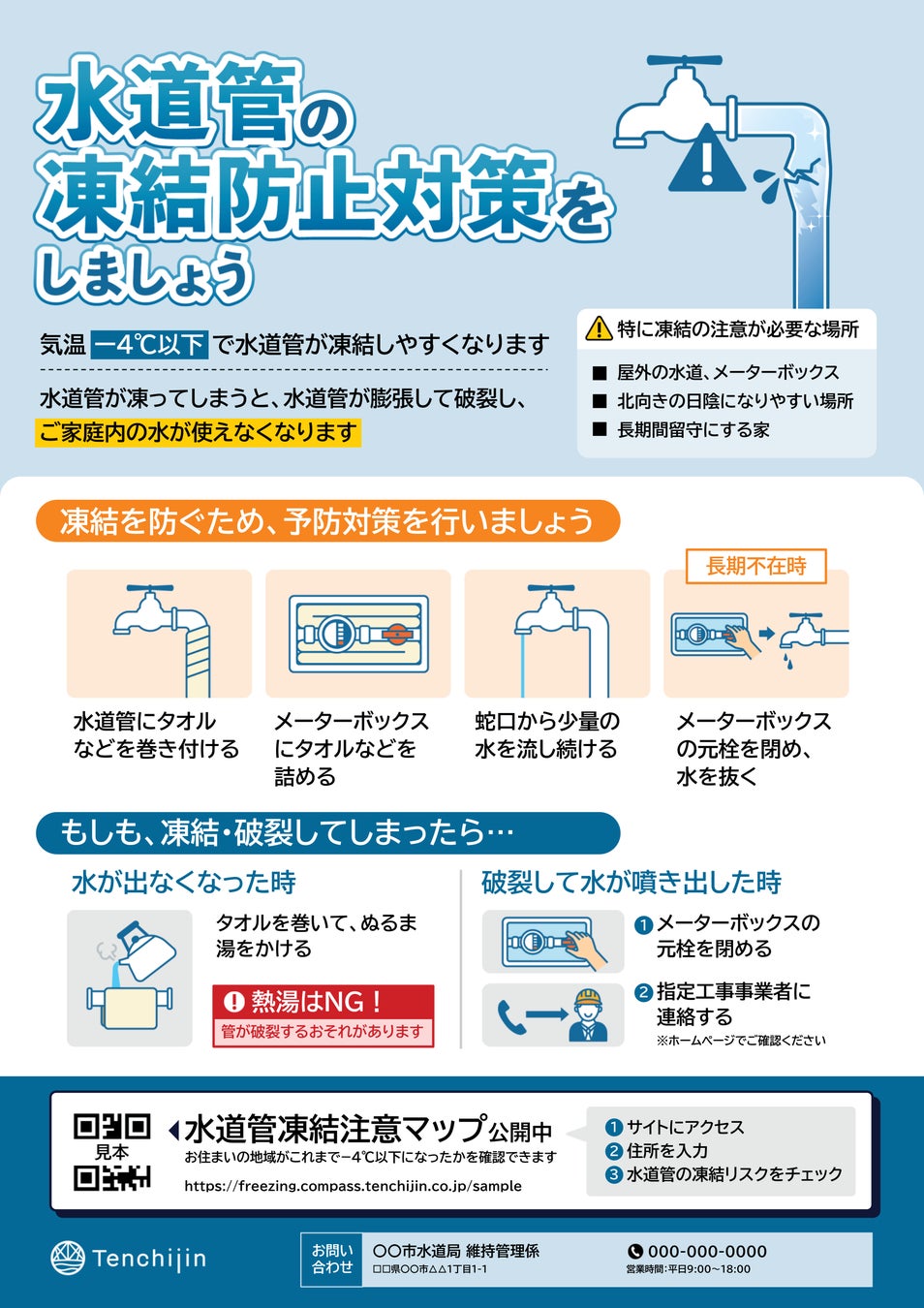 さらに、住民の方への注意喚起チラシもあわせてご提供可能ですので、現場の職員の皆様の負担を増やすことなく、今冬からすぐに凍結対策を強化することができます。