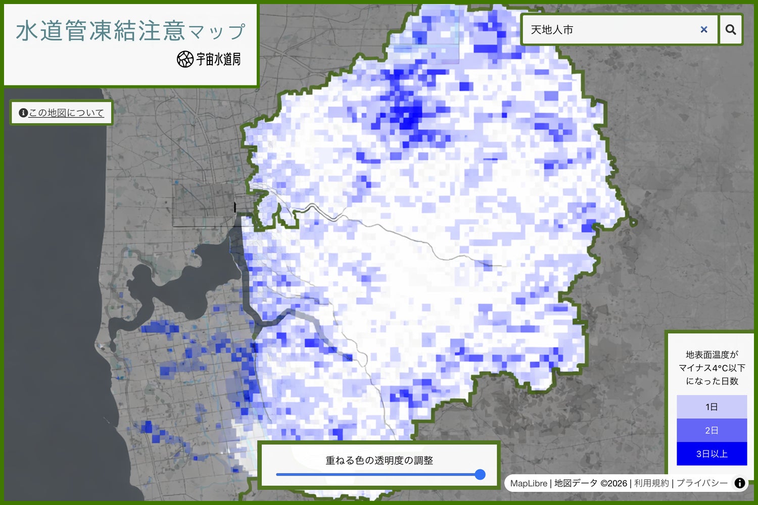 JAXAベンチャー天地人、衛星データを活用した「水道管凍結注意マップ」を提供開始。住民の対策行動を促し、凍結による水道管破損・漏水事故を未然に防ぐ