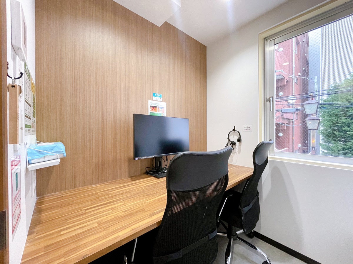 1名用個室の机幅は、ゆったりした空間をご提供。完全個室には27インチの4Kモニター完備のため、web会議はもちろん、いつも以上に集中して仕事・勉強したいときに最適です。