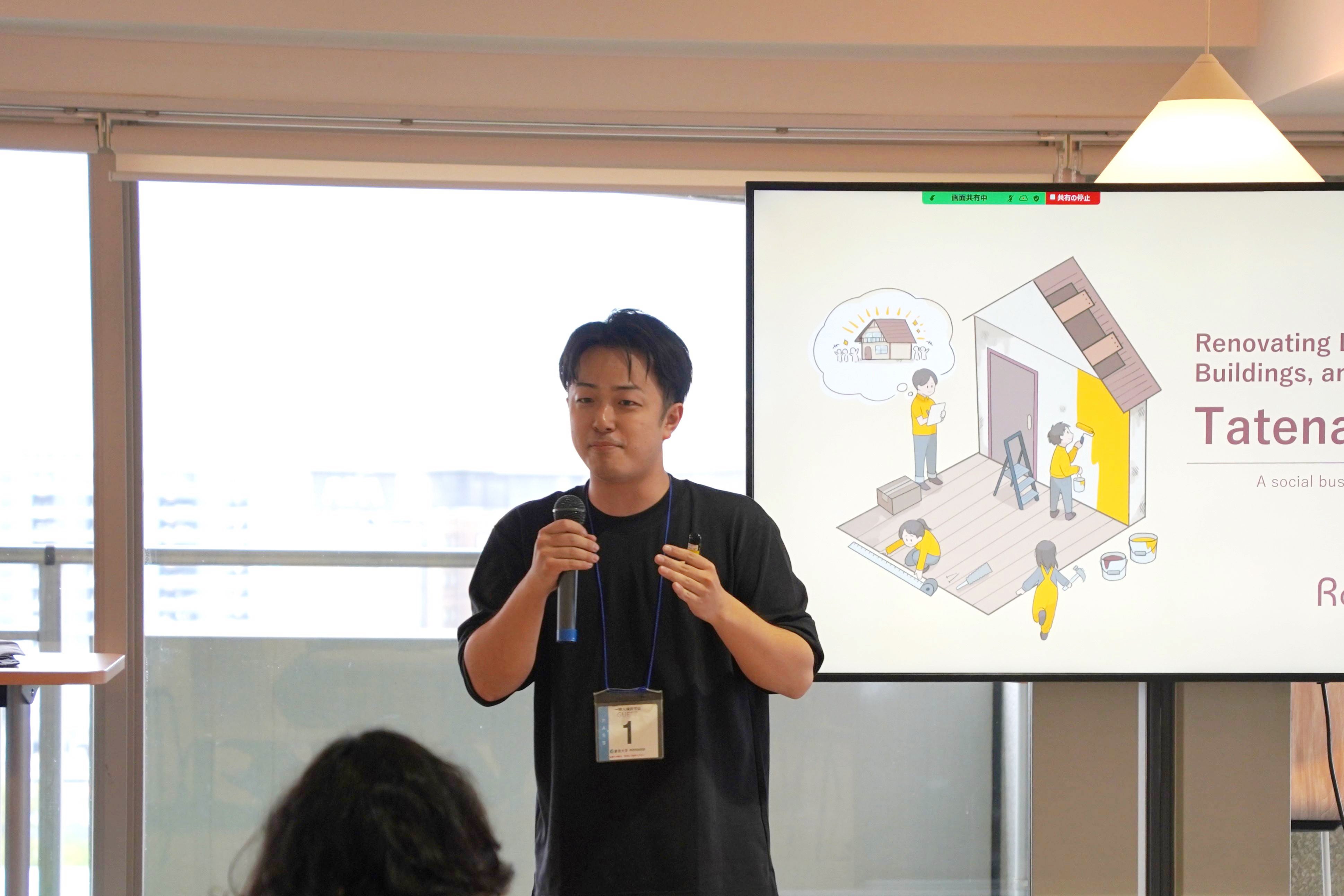 政府がその解決に苦慮する中、合同会社Renovate Japanは社会的企業として、空き家のリノベーションプロセスを活用することで解決への取り組みを行っていること、また「タテナオシ」と呼ぶこのアイデアが、ビジネスの利益と社会貢献のトレードオフを大幅に減らすだけでなく、地域コミュニティの力の強化に繋がっていることをお話しされました。そこで展開するタテナオシ事業では、失業やDV被害等により家や仕事を失い、一時保護を必要とする方々の受け入れや生活再建の支援を、リノベーション中で一般市場に出る前の空き家等の物件を活用して行っています。