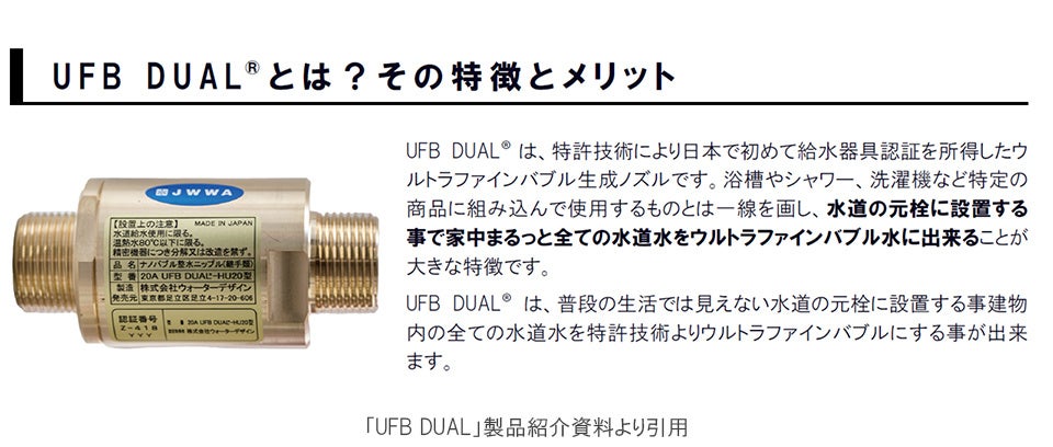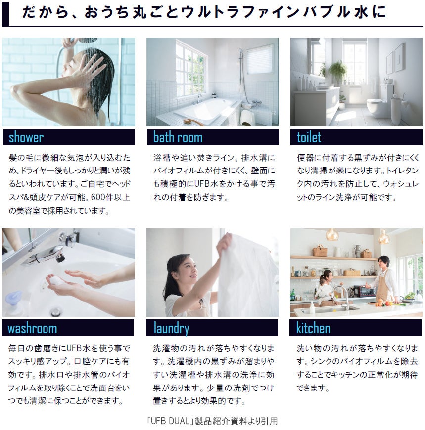 内装はシンプルでありながら素材感を重視し、住む人のライフスタイルや家具選びを引き立てます。また、全住戸にナノサイズの極小の気泡「ウルトラファインバブル」を生成するノズル「UFB DUAL」を設置し、ウルトラファインバブル水を供給しています。ウルトラファインバブル水は浴室では保湿効果を高め、キッチンでは食器汚れを効率的に落すほかシンクや排水溝が汚れにくいなど、快適且つ清潔な日常生活を実現します。