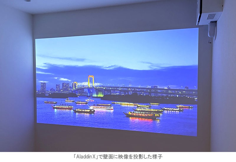 本物件のもう一つの大きな特徴として、計4戸の地下メゾネットタイプのプランを用意し、当プランにはシーリングライト一体型プロジェクター「Aladdin X」を標準設置しています。天井設備から壁に映像を投影することで場所を取らず、照明機能と共に大画面映像と高音質スピーカーを楽しめる快適な住空間を提供します。