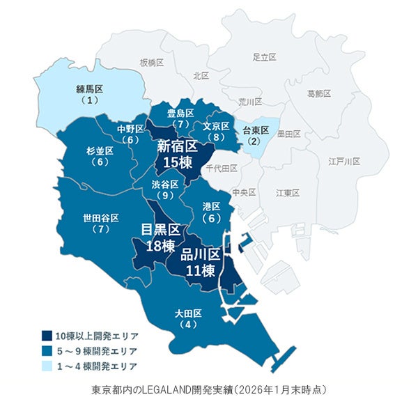 当社が開発するデザイナーズ賃貸マンションシリーズ「LEGALAND」は、これまで東京都内を中心に国内100棟を超える開発実績(LEGALAND+含む)を誇っています。当社がこれまで培ってきた不動産開発のノウハウやこだわりによって生み出される「LEGALAND」は、快適な居住空間をご提供するとともに、優れた投資資産として国内外の事業会社及び個人投資家様からも高い評価をいただいています。