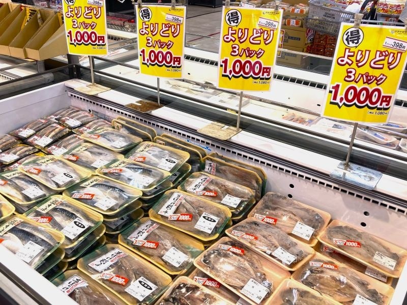 また、7月よりはじまった通常 1 パック 398 円の商品がよりどり 3 パックで 1,000 円(税込み1,080円)となる「よりどり3パック 1,000 円セール」も、引き続き開催しております。切り身、刺身、干物のほか、煮魚やフライ等のお惣菜、お寿司もお得にお買い求めいただけます。解体ショーと合わせて、お買い物をお楽しみください。