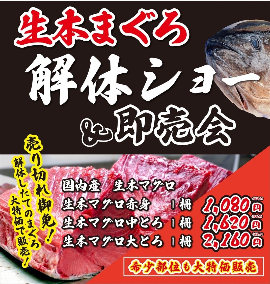 毎月恒例・大好評の「生本まぐろ解体ショー」「サカナタベタイMEGAドン・キホーテ本八幡」2024年8月24日(土)11時より開催!