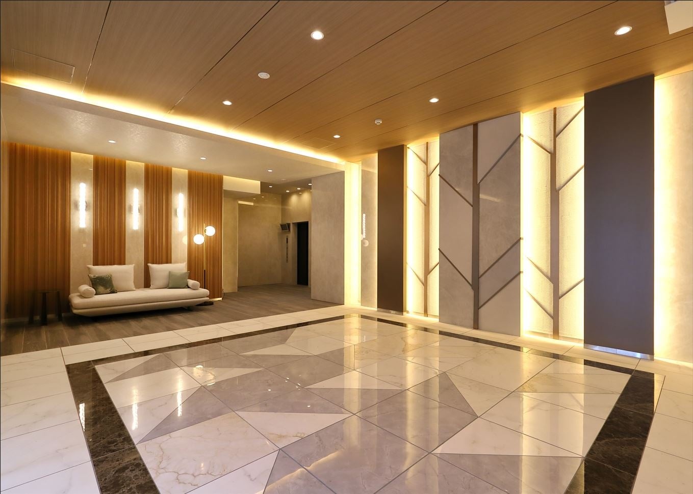 当物件は信和グループ・新都計画が手掛ける設計で、外観・エントランスはダイナミックかつシンプルで洗練されたファサード、並⽊道の⽊をイメージした意匠壁には、種類の違う⼤判タイルで葉を表現、ブロンズ⾦物で幹、枝をイメージした高級感があふれる中にも安らぎのあるデザインに仕上げており、外観から室内、設備までハイグレードな賃貸マンションとなっております。