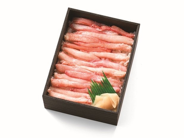 北陸線(開業当時の名称)で初めて駅弁を販売したという老舗調製元「高野商店」。ベニズワイガニの脚肉(むき身)を酢飯の上に贅沢に敷き詰めた当駅弁は、30年以上作り続けられている看板商品です。ベニズワイガニの香りと甘味、しっとりとした食感が堪能できる駅弁です。