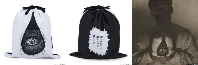 巾着の前面には富江の目が、裏面には男を惑わす印象的な富江の台詞「街へ出たいわ 連れてって頂だい!」がデザインされています。