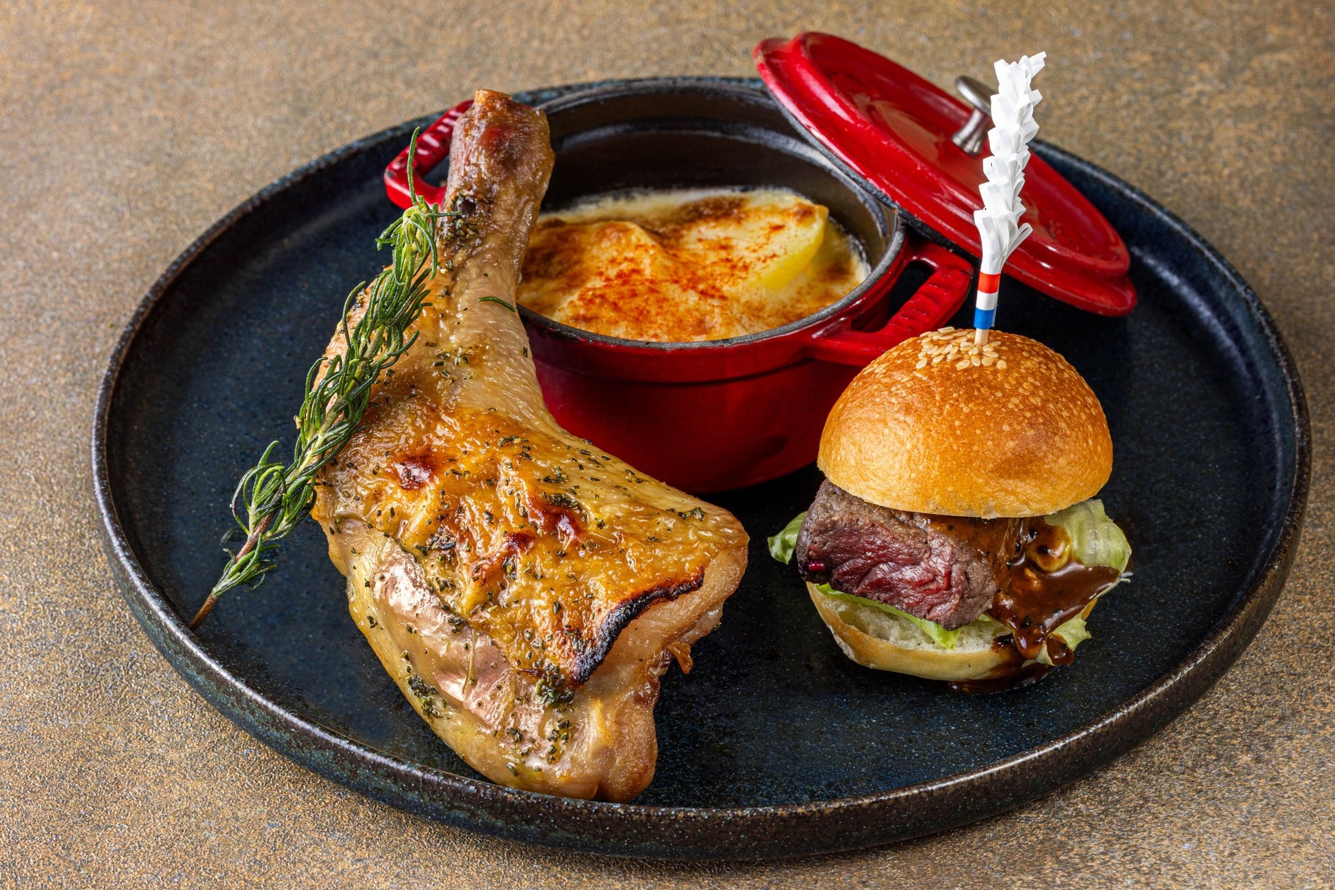 ・牛フィレ肉のステーキサンド トリュフソース・骨付きローストチキン ローズマリーの香り