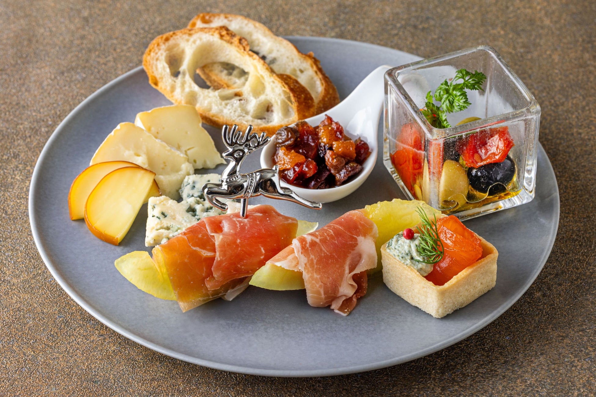 ・ハモンセラーノとメロンのピンチョス・チーズの盛合せ ドライフルーツのコンポート