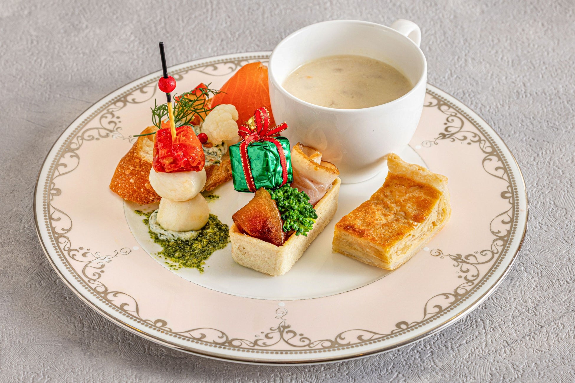 ・オニオングラタンのキッシュ・サーモンマリネとフロマージュブランのカナッペ ディル風味