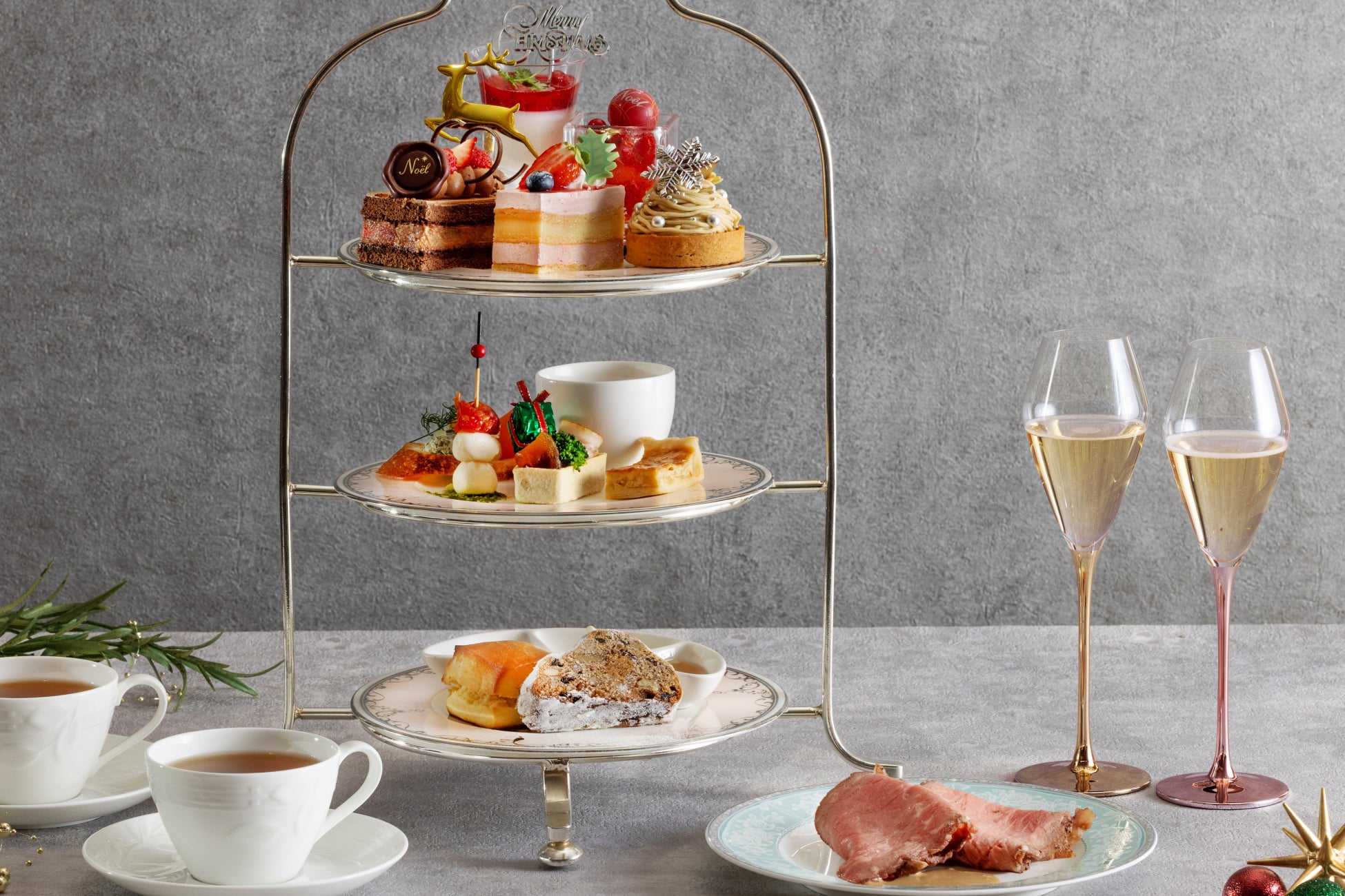 ■大切な方との特別な夜には〈クリスマスイブニングハイティー シャンパンフリーフロー〉カップルやご夫婦でクリスマスの雰囲気を味わえる、イブニングハイティーをご用意いたします。“モエ・エ・シャンドン”シャンパンのフリーフローとともに、夕暮れから夜へと移ろうロマンティックな時間をお過ごしいただけます。フレンチシェフ髙木が手がける、贅沢なメニューがクリスマスを優雅に演出。「ノルウェー産サーモンとフロマージュブランのタルトレット」や「ハモンセラーノとメロンのピンチョス」など、3段のハイティースタンドでお届けします。メインプレートには、「骨付きローストチキン」やトリュフソース香る「牛フィレ肉のステーキサンド」、アツアツの「ジャガイモのココットグラタン」など、シェフこだわりのクリスマスにぴったりなお料理が揃います。デザートには、クリスマスカラーが鮮やかな「苺とピスタチオのパフェ」をご提供。甘く華やかな香りが季節ならではの高揚感をさらに引き立てます。煌めくシャンパーニュの泡、音楽、夜景に包まれるラグジュアリーなひとときを心ゆくまでご堪能ください。