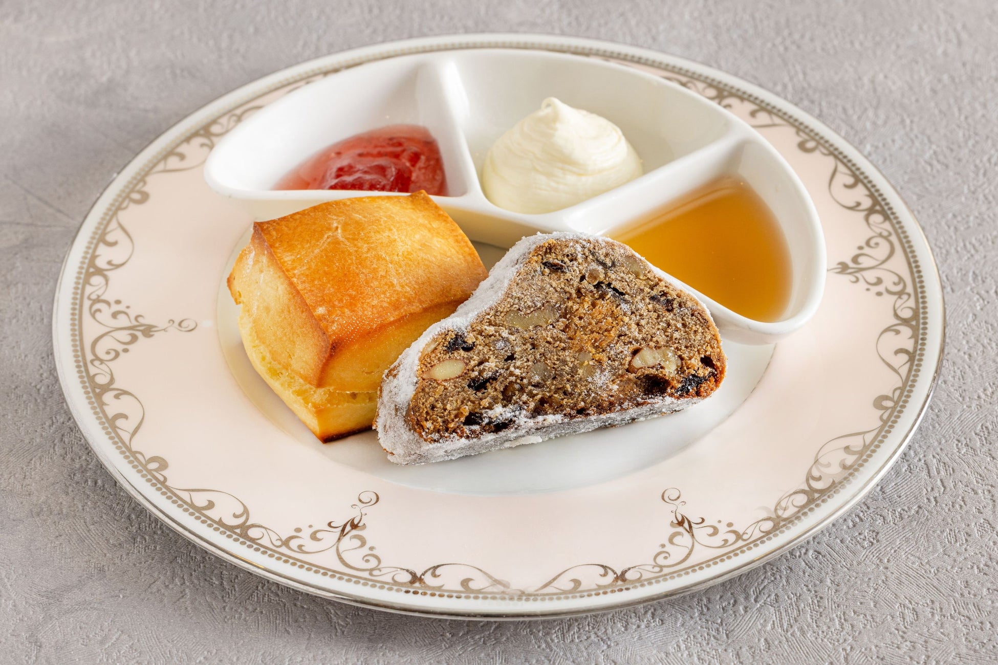 ・プレーンスコーン、シュトーレン ジャム、クロテッドクリーム、メープルシロップ