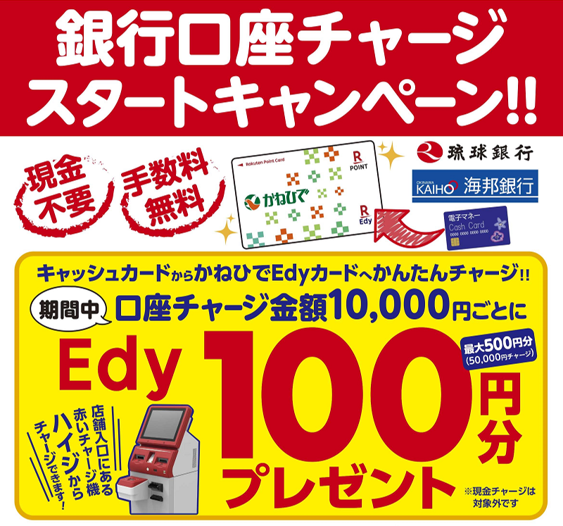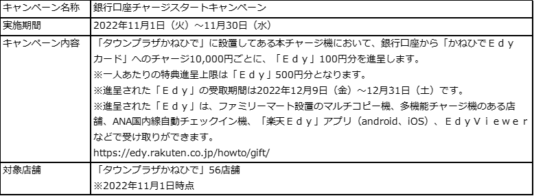 本キャンペーンでは、「タウンプラザかねひで」に設置してある本チャージ機において、銀行口座から「かねひでEdyカード」へのチャージ合計金額10,000円ごとに「Edy」100円分を進呈します(注4)。詳細は下記のキャンペーン概要をご確認ください。