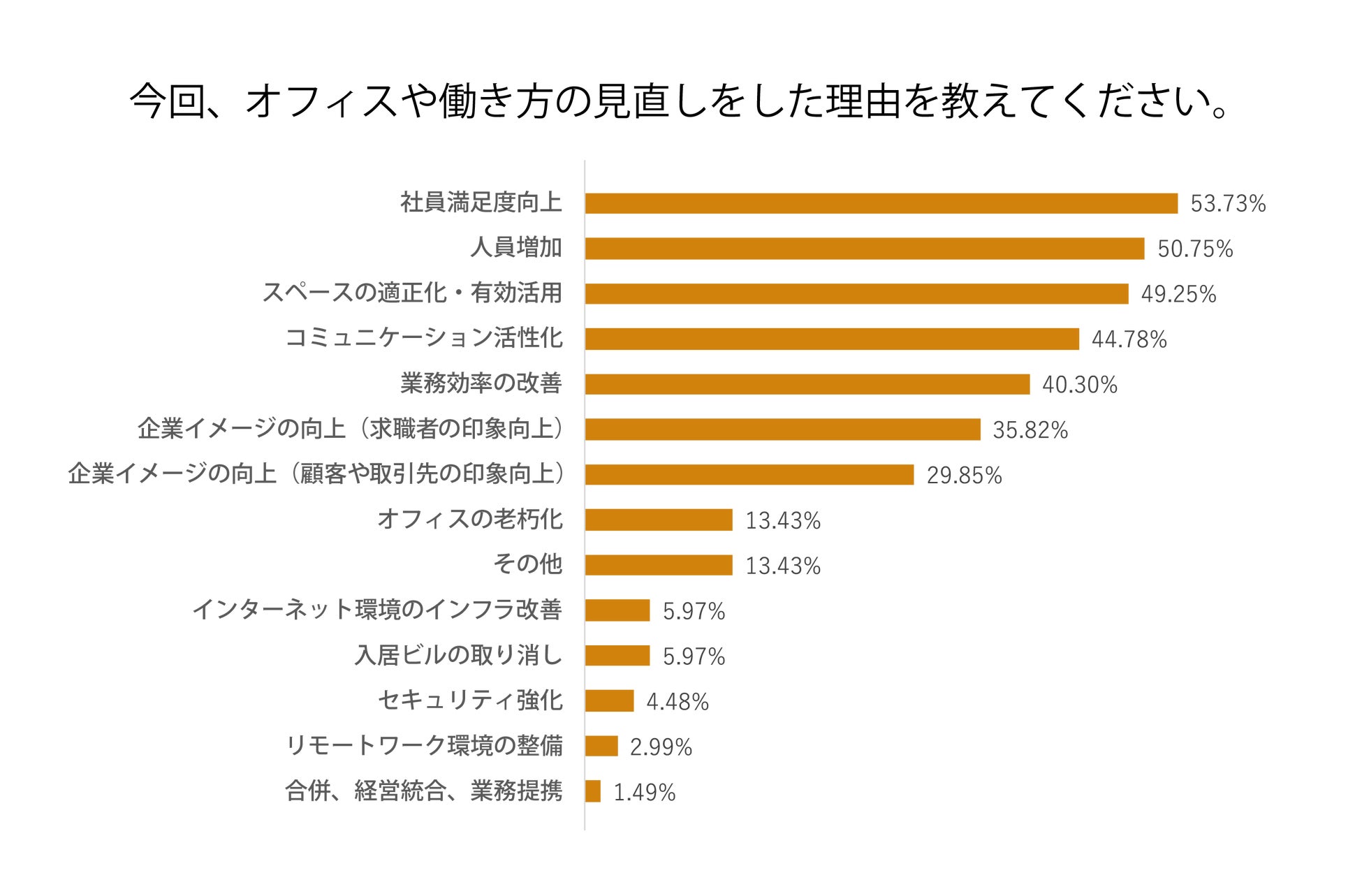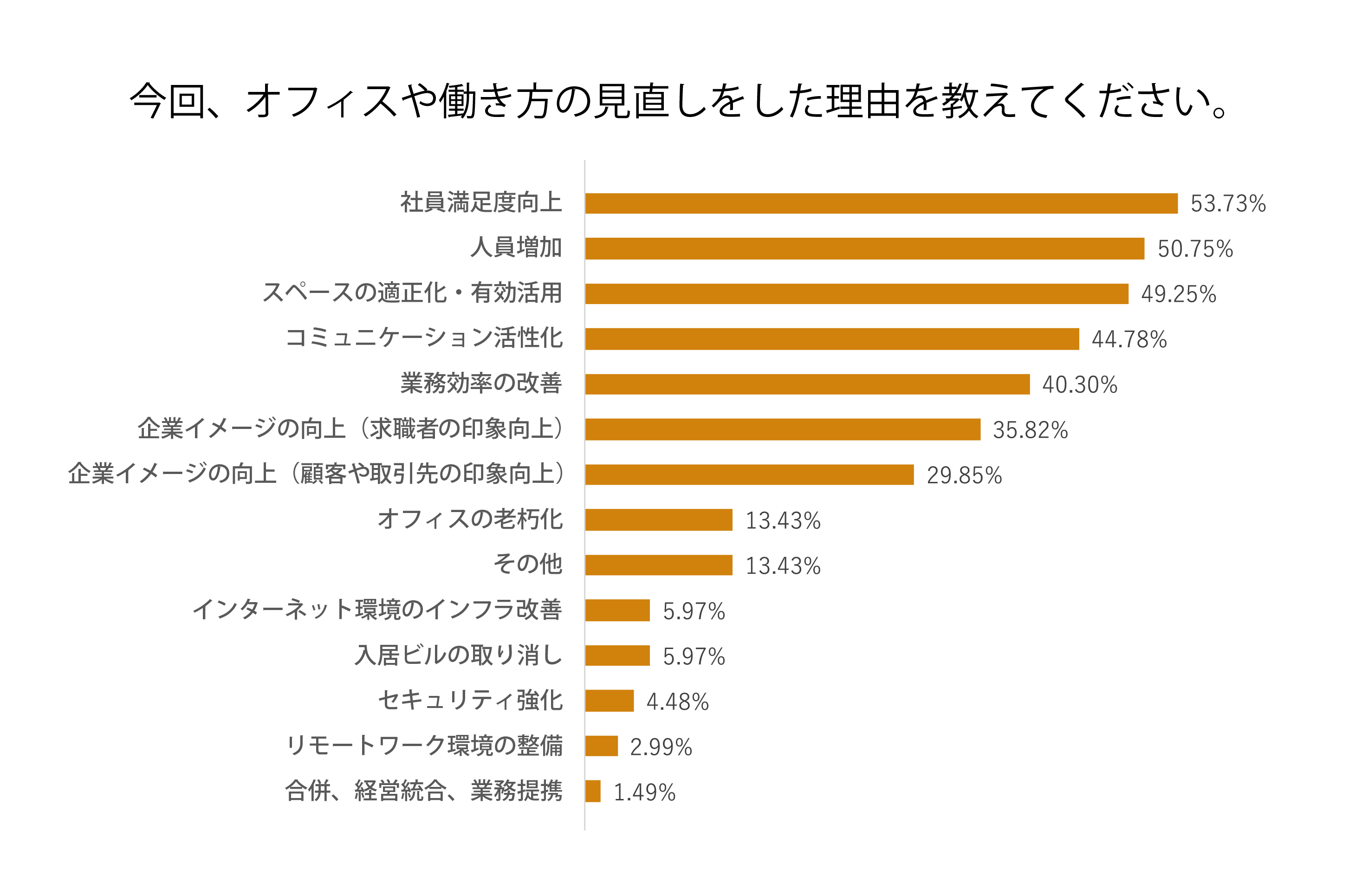 今回のアンケートでも、引き続き「社員満足度の向上」が最も多い理由となりました。人的資本経営への注目が高まる中、企業は社員一人ひとりの働きやすさや充実感を重視し、オフィスを単なる“働く場”から“豊かさを育む場”へと捉え方をシフトしている様子がうかがえます。
