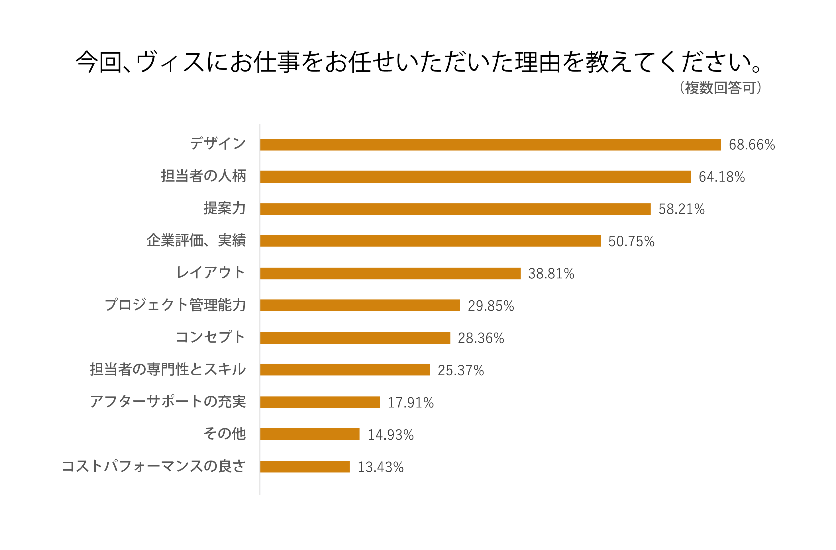 昨年に続き「デザイン」が最も多くの理由として挙げられました。ヴィスでは社員の約25%がデザイナーであり、プロジェクトごとにアサインされたデザイナーが、お客様の課題や想いを直接ヒアリングし、提案から完工まで一貫して伴走します。