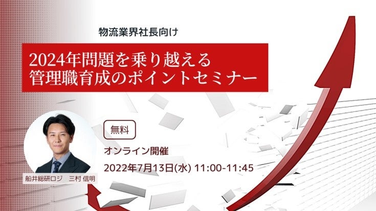 ロジスティクス・物流コンサルティングサービスを提供する船井総研ロジ株式会社(以下「船井総研ロジ」)は、 2022年7月13日(水)11:00-11:45、運送・物流企業における最新の管理職育成手法を解説する無料のオンラインセミナーを開催します。働き方改革時代に求められる管理職の役割とスキルについて、くわしく解説します。ぜひ、ご参加ください。